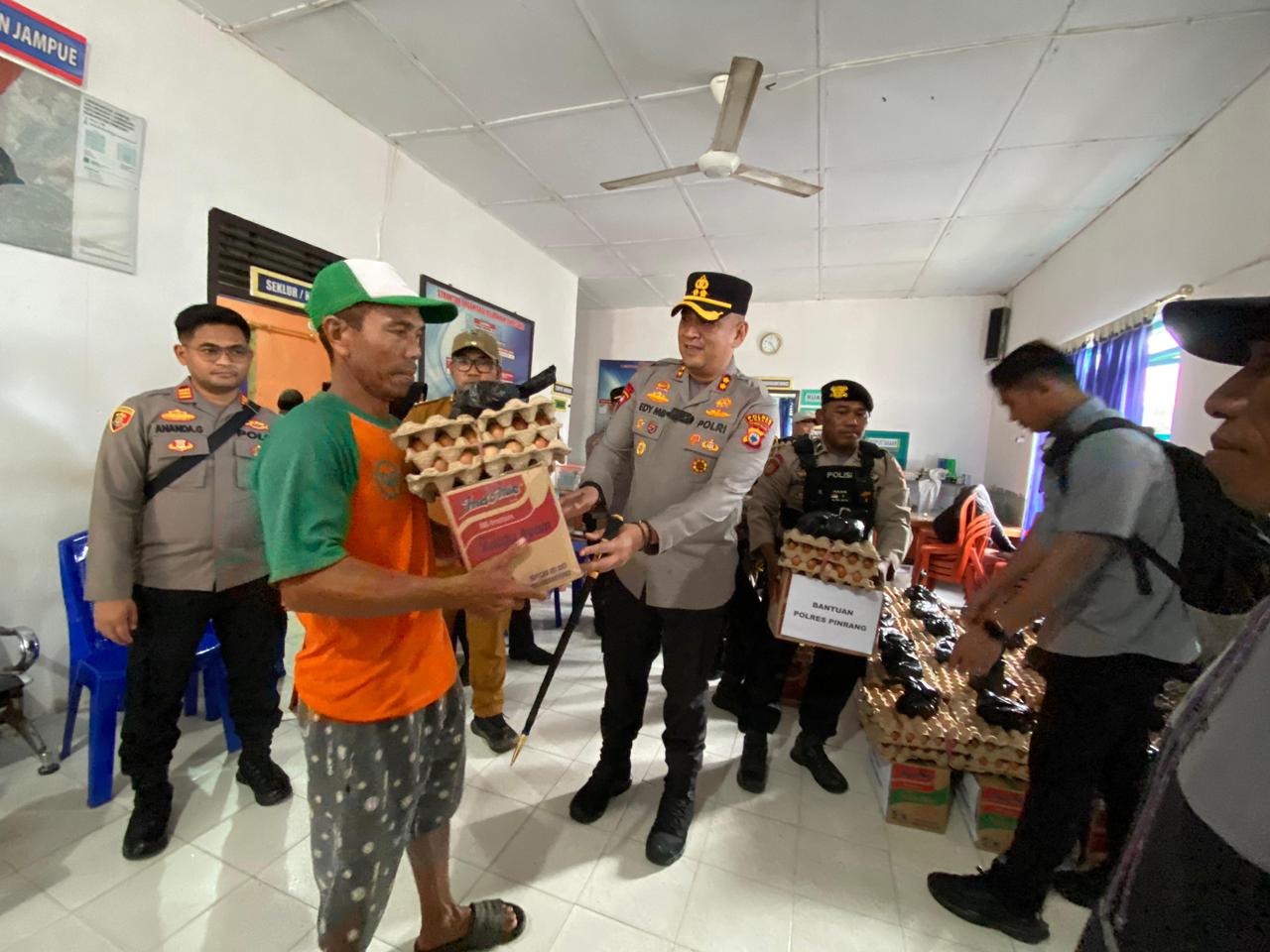 Sebagai wujud kepedulian, Kapolres Pinrang menyerahkan bantuan sembako secara simbolis berupa ikan sarden, telur, dan mi instan kepada warga.