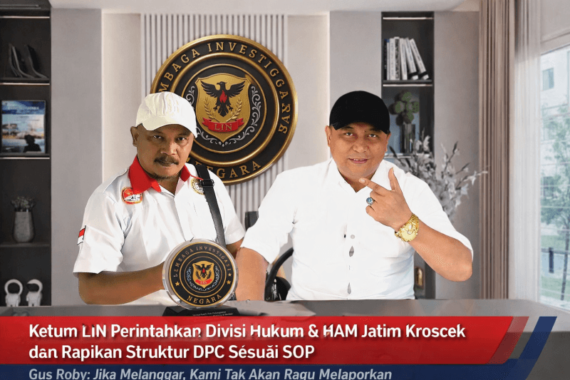Jawa Timur, www.mellotvnews.com — Ketua Umum Lembaga Investigasi Negara (LIN), Robi Irawan Wiratmoko, yang akrab disapa Gus Roby, mengeluarkan instruksi tegas kepada Divisi Hukum dan HAM LIN di Jawa Timur untuk melakukan kroscek menyeluruh serta merapikan struktur Dewan Pimpinan Cabang (DPC) di seluruh kabupaten dan kota.